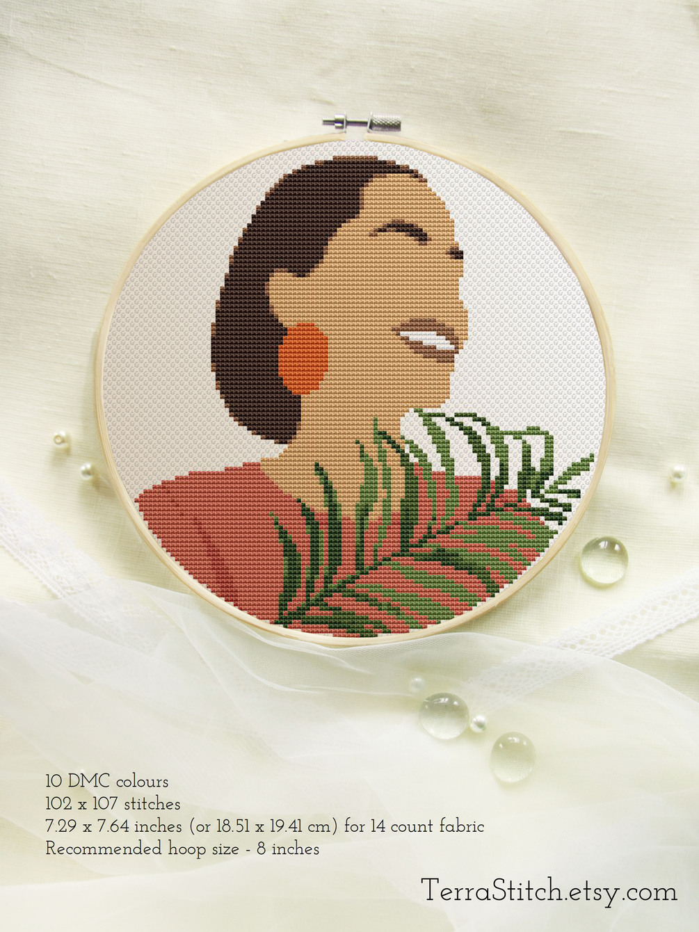 Female cross stitch pattern Boho woman cross stitch PDF Tropical palm leaf cross stitch Girl face