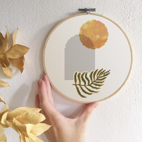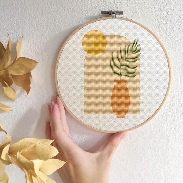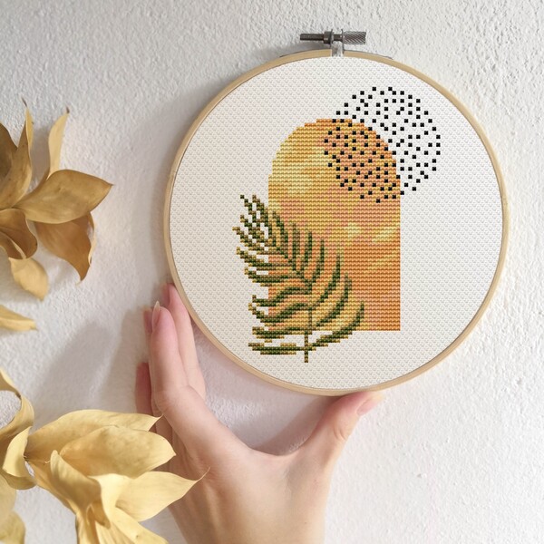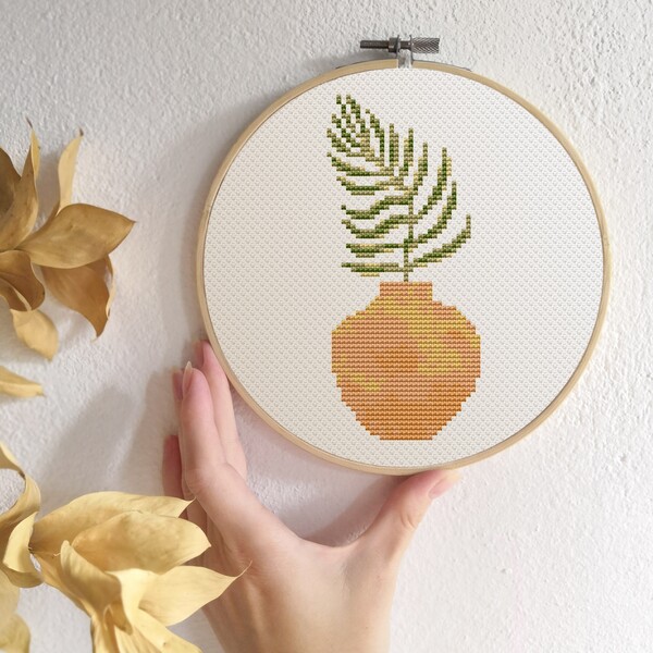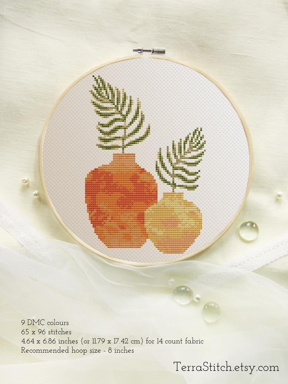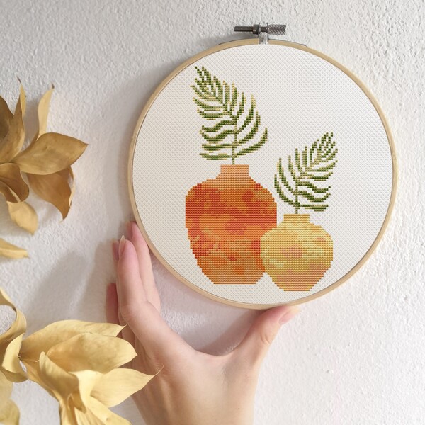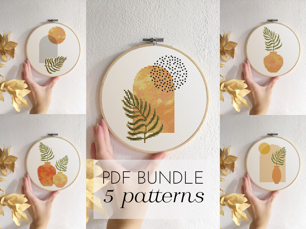 Set of 5 cross stitch patterns PDF Boho cross stitch Palm leaves pattern bundle Modern cross stitch set Boho vases Abstract pots